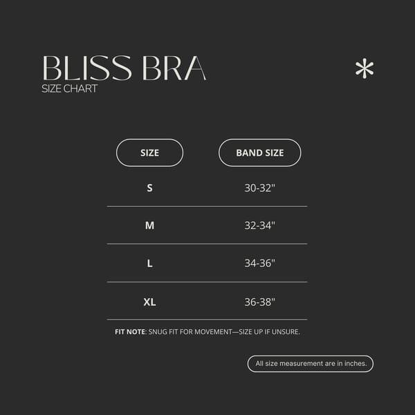 If you are in between sizes, we recommend sizing up. The Bliss Bra is designed for a snug, supportive fit that stays in place during movement.